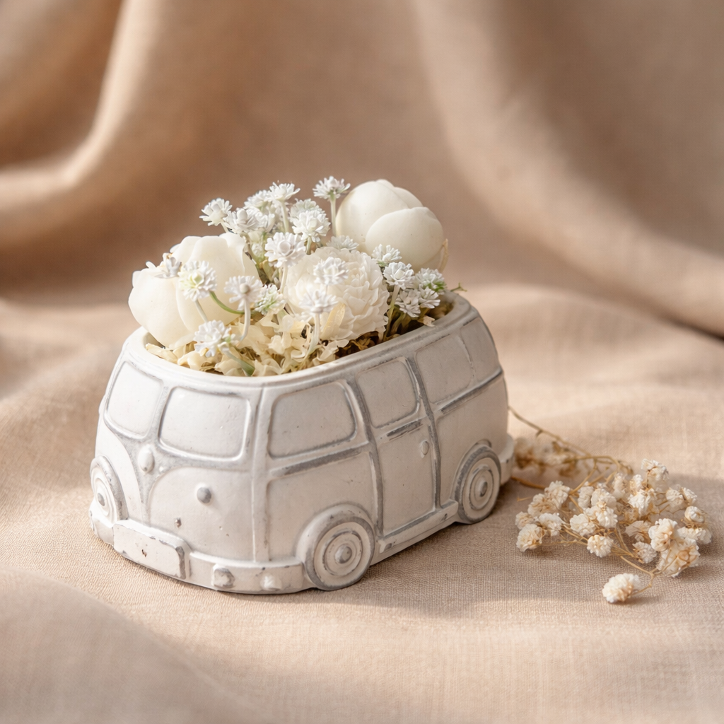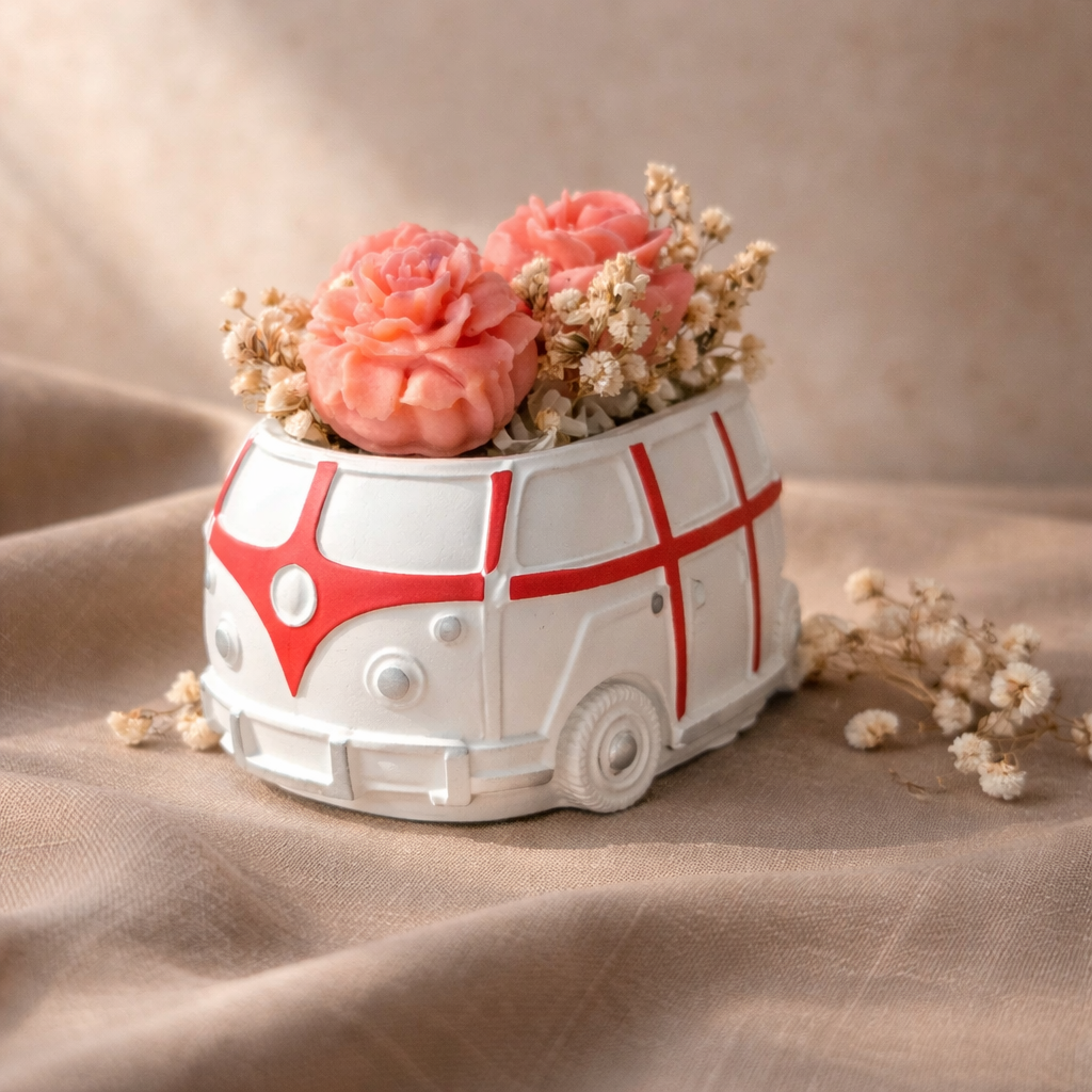 Egy igazán különleges, kézzel készült dekoráció, amely a vintage hangulatot és a finom eleganciát ötvözi. A részletgazdag kisbusz formájú tartóban elhelyezett rózsa gyertyák meghitt, romantikus légkört teremtenek, miközben stílusos díszei bármely térnek.