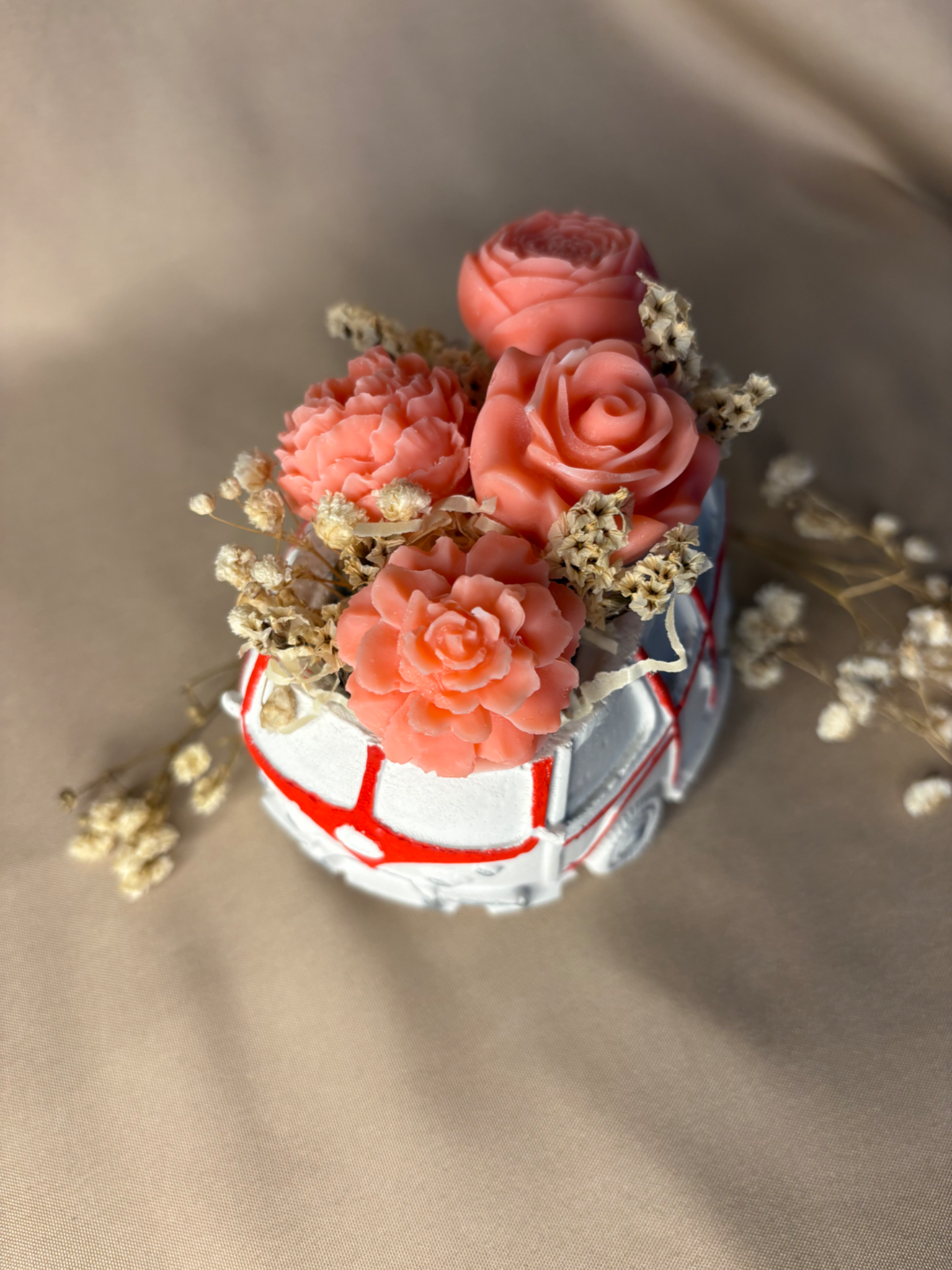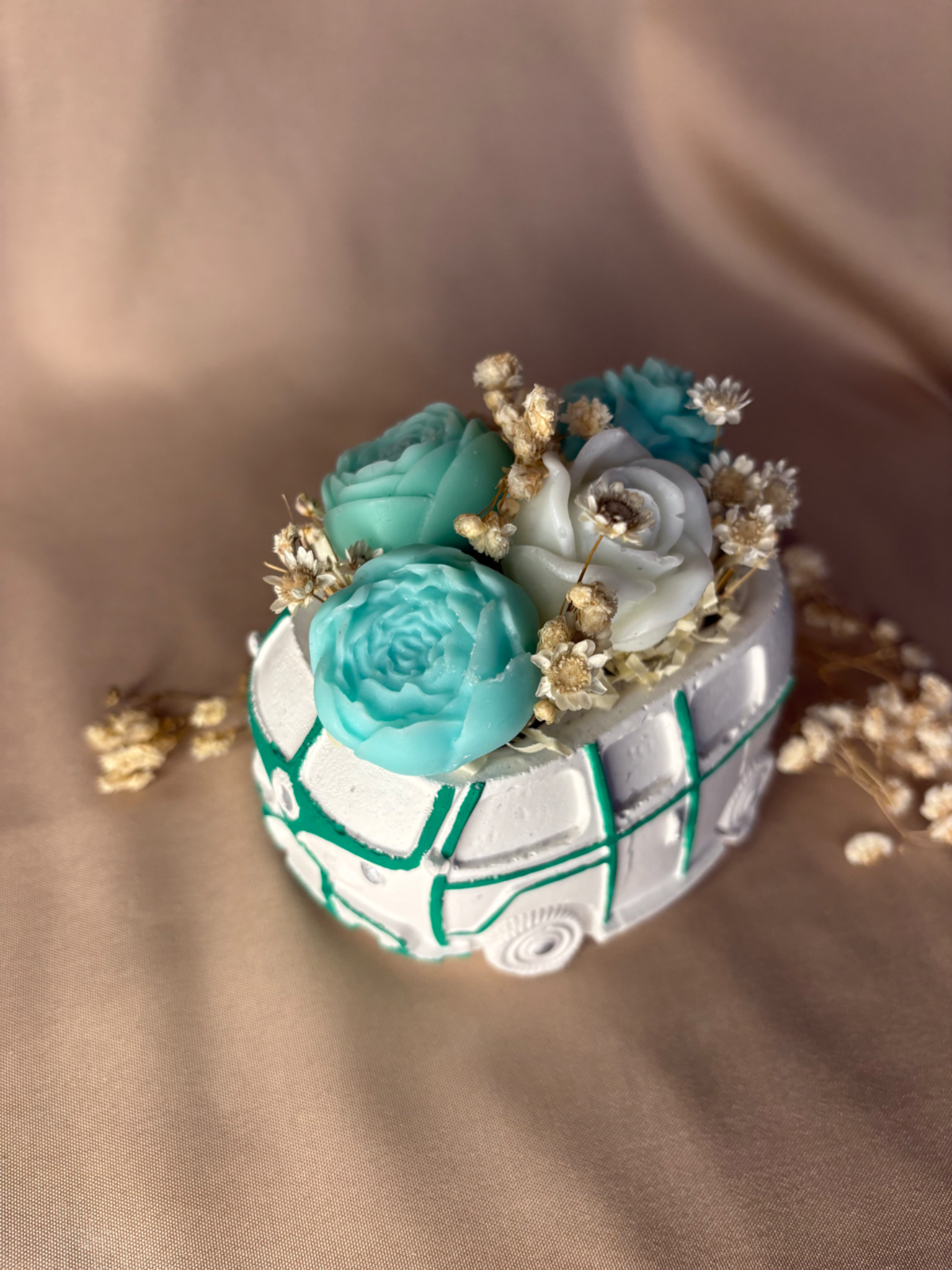 A vintage buszok egységes kompozícióban készülnek el, a busz színéhez harmonizáló árnyalatú virágok kerülnek bele, így minden darab tökéletesen összehangolt megjelenést kap.